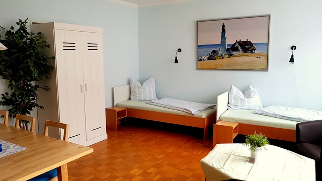 Unsere Ferienwohnung "Alte Werkstatt" in der Hauptstrasse 63, für bis zu sechs Personen, verfügt über ein separates Schlafzimmer, sowie den kombinierten Wohn- und Schlafraum mit großem Esstisch, Küche und Duschbad.
